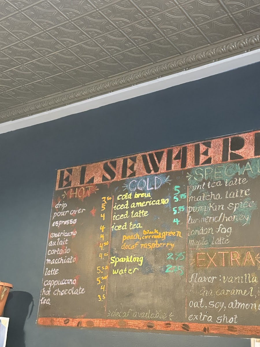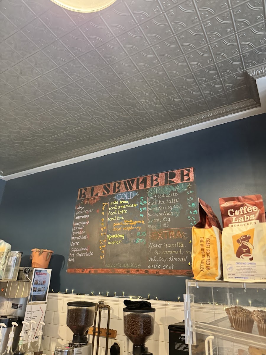 Elsewhere Espresso, located at 335 E 6th St, New York, NY 10003, offers a simple yet delightful menu that captures the essence of a cozy café experience. Their Dessert selection includes freshly baked Croissants and Pastries, ideal for pairing with any of their drinks. For coffee enthusiasts, the drink menu is equally inviting, with options that cater to all tastes. Whether you're in the mood for a classic Drip Coffee or the more intricate Pour Over, Elsewhere Espresso ensures a rich, flavorful experience. The menu also includes beloved staples such as Americano, Cortado, and Latte, each prepared with precision to bring out the perfect balance of strength and smoothness. Whether you're stopping by for a quick coffee break or indulging in a treat, the combination of quality beverages and pastries at Elsewhere Espresso makes it a must-visit destination for coffee lovers in New York.